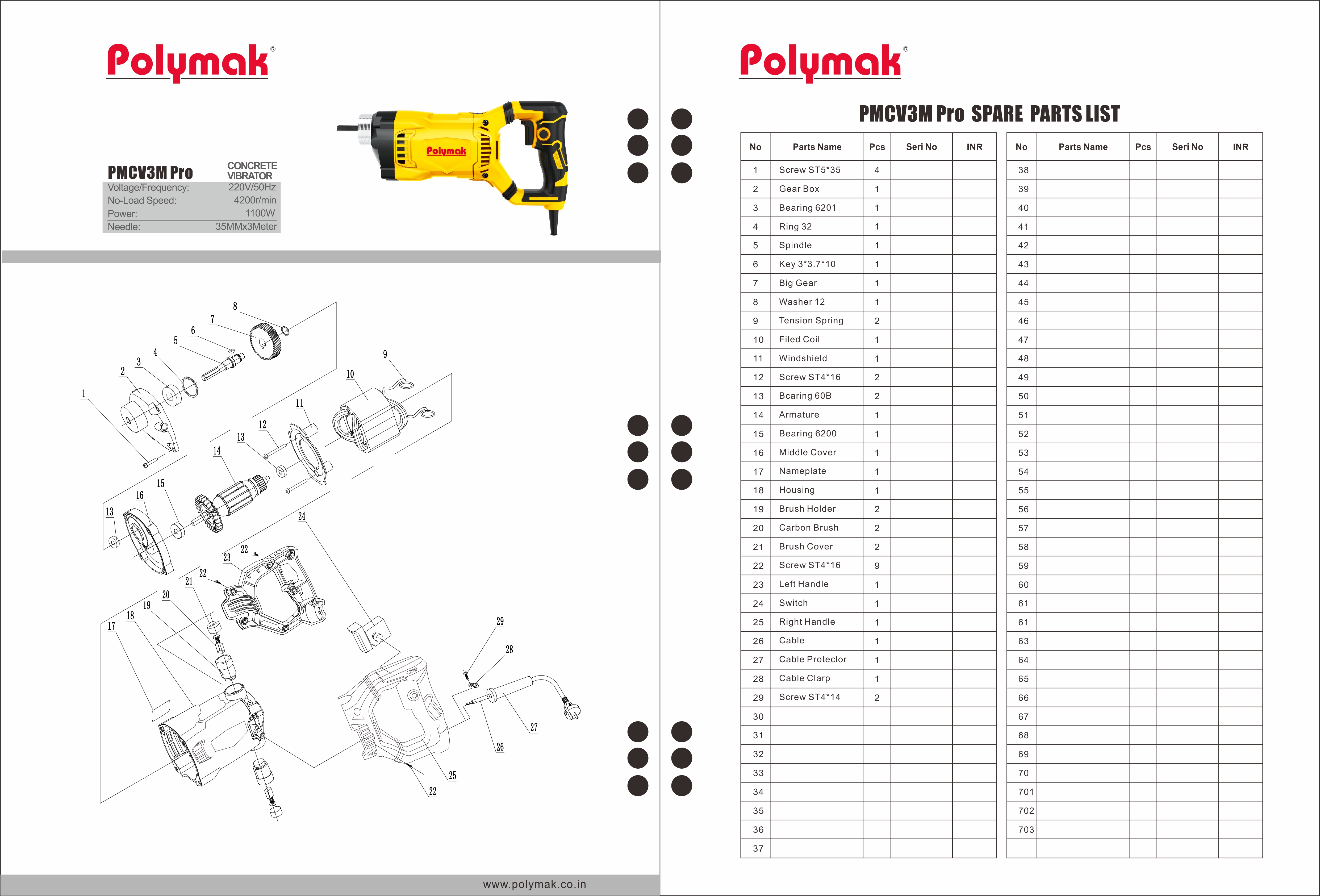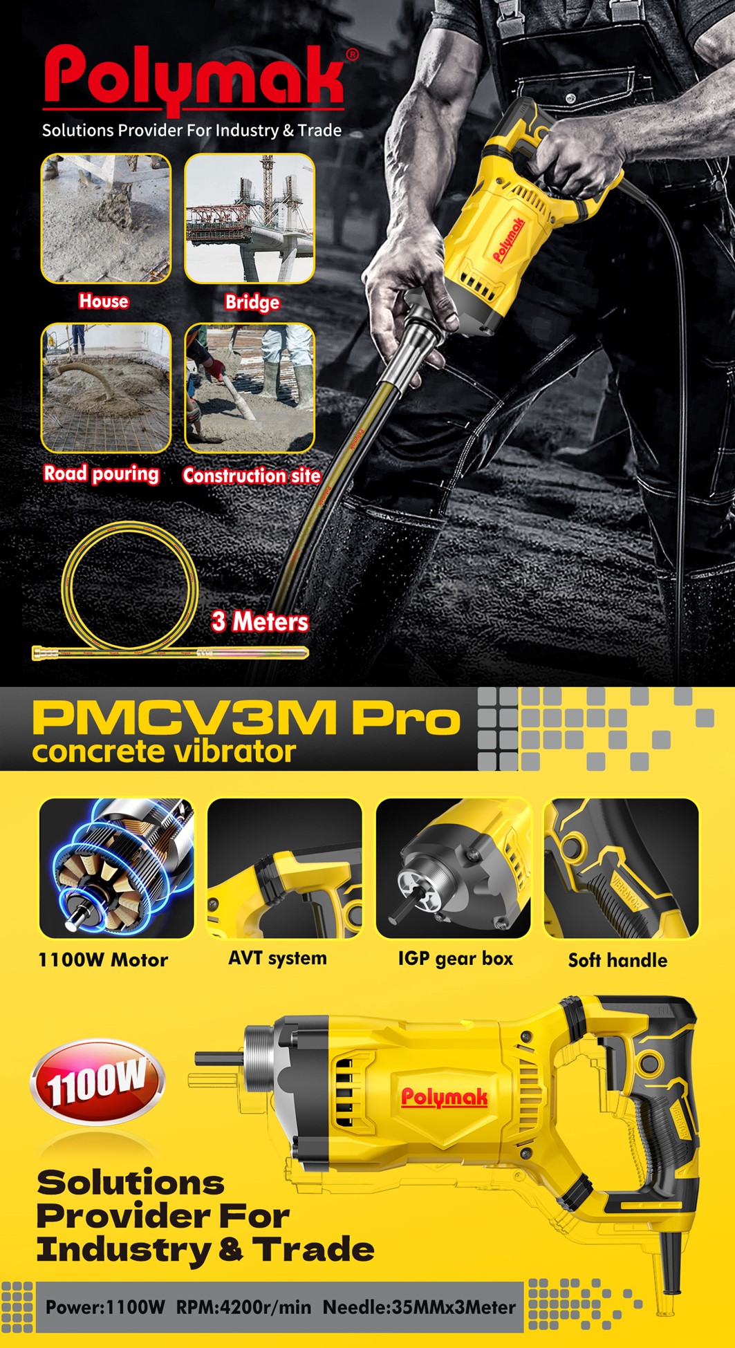 Concrete Viberator with 3 Mtr Needle 1100 Watts wth Anti Vibration Technology (AVT)